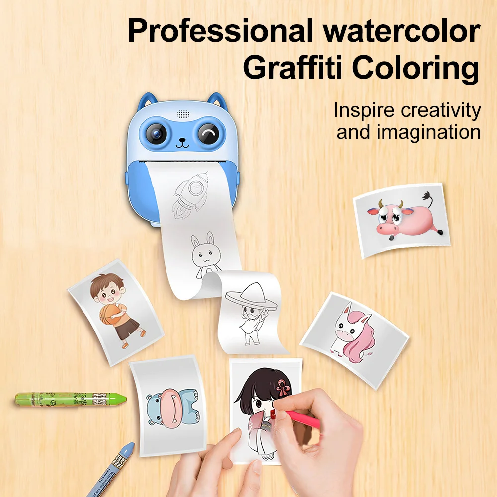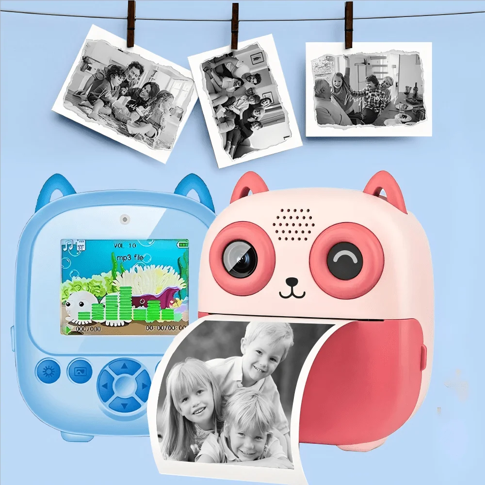 Momentinio spausdinimo skaitmeninis fotoaparatas – mažas nešiojamasis nuotraukų spausdintuvas su mielu animaciniu dizainu, momentiniu juodai baltu spausdinimu