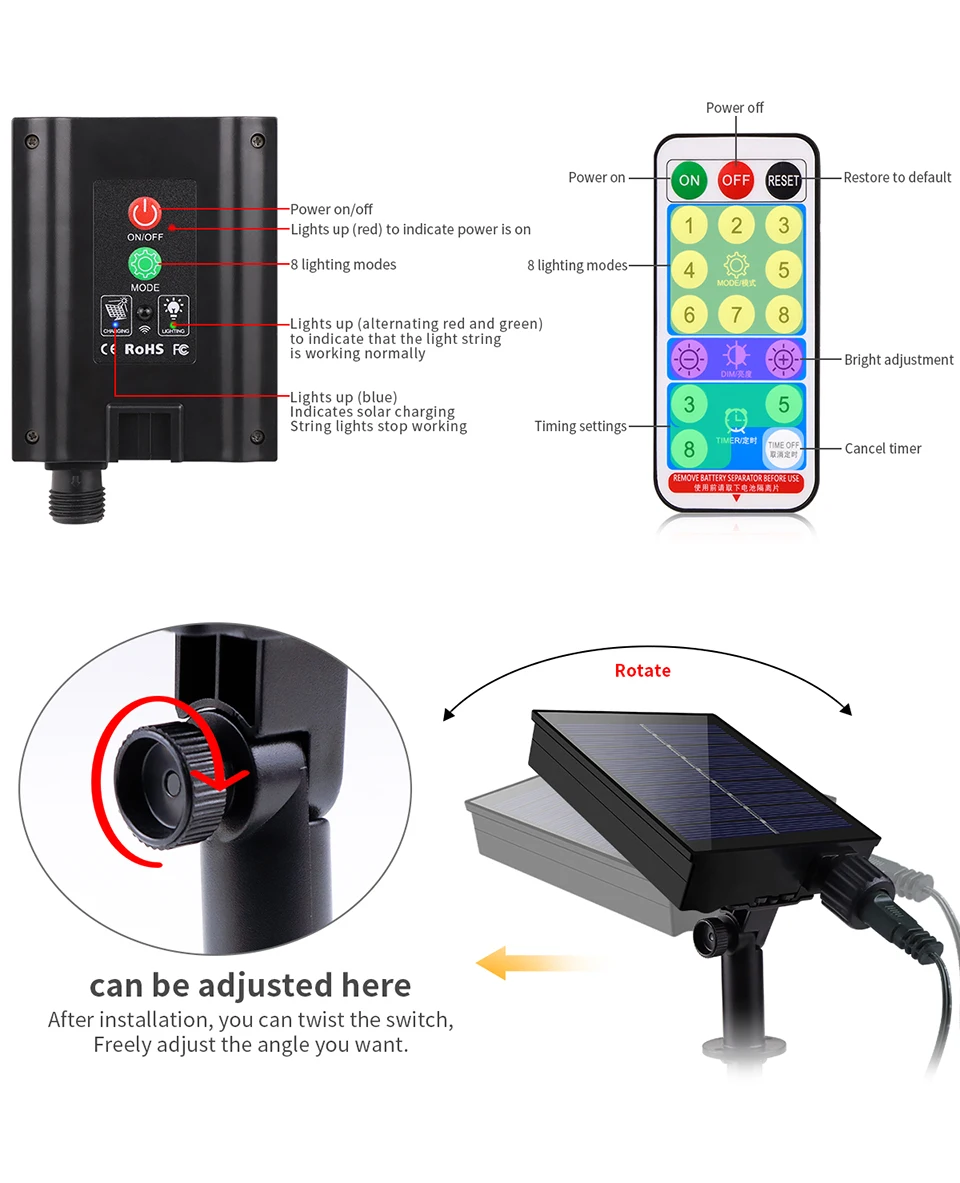 Specifikacijos: Tipas: itin ryškios 24V LED lemputės LED spalva: šilta balta/balta/daugiaspalvė Ilgis: 50M LED skaičius: 500LED Saulės skydas: 4,5V 250MA Baterija: 3,7 V 1200 mAH 18650 ličio baterija Atsparumo vandeniui lygis: IP67 Valdymas: skydelis + nuotolinio valdymo pultas Įkrovimo laikas: 4-6 valandos Darbo laikas: 5-6 valandos Darbo režimas: 8 režimai Tvirtinama prie sienos arba įkišama į žemę PASTABA: Šviesa veiks savaime, kai aplinkos ryškumas yra mažesnis nei 30 liuksų, gali veikti maždaug 14–40 valandų po pilno įkrovimo per dieną, yra atsparus vandeniui, galite įdėti į lauką lyjant, bet NENAUDOKITE po vandeniu. Į paketą įeina: 1 x saulės baterija 1 x 20 cm smaigalys 1 x LED lemputės Priminimas: Sveiki, gerbiamas kliente, kviečiame įsigyti mūsų gaminių. Mūsų gaminiai buvo išbandyti ir turi kokybės užtikrinimą. Jei turite problemų dėl produktų kainos, kokybės ir naudojimo, susisiekite su mumis laiku ir mes greitai jas sutvarkysime. Dėkojame už palaikymą ir supratimą..